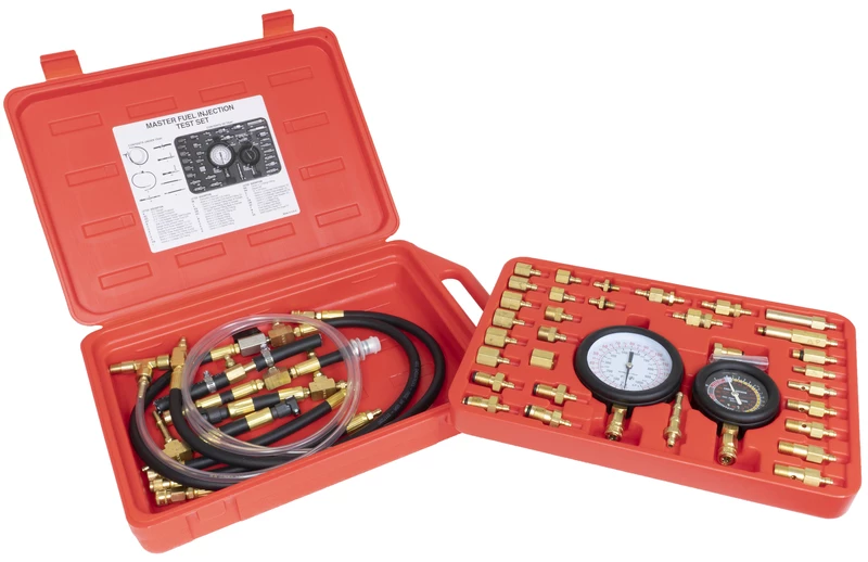 Set checks fuel pressure on most Port Fuel Injection (PFI) and Throttle Body Injection (TBI) systems. Comes with a variety of adapters and gauges for checking many types of systems. Adapts to work with test port connections, end of hose connections and in-line connections. Tests GM, Ford, Chrysler, Honda/Acura, Toyota, Bosch CIS and L-Jetronic. List of component parts included with instructions.