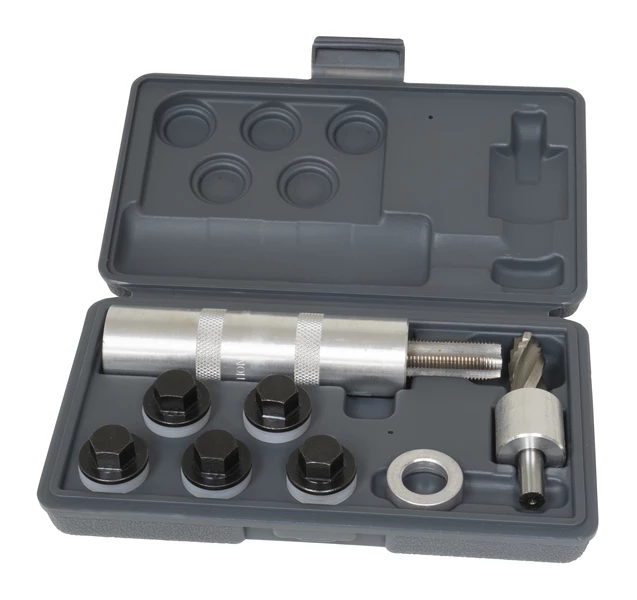 This set includes a piloted drill, spring-loaded tapping tool and 5 magnetic drain plugs. The unique tapping tool ensures the new thread will be perpendicular to the gasket surface to prevent leakage. Works on soft steel and aluminum oil pans with 1/2″, 12mm & 14mm threads. Can be used on the vehicle when room permits.