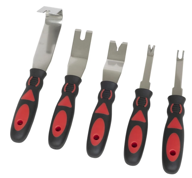 The five-piece set comes with both u notch and v notch ends to fit numerous different style and size panel clips. The smooth shaft is made from stainless steel and provides a fulcrum point to lift the clips. Tools can be stored in plastic tray.